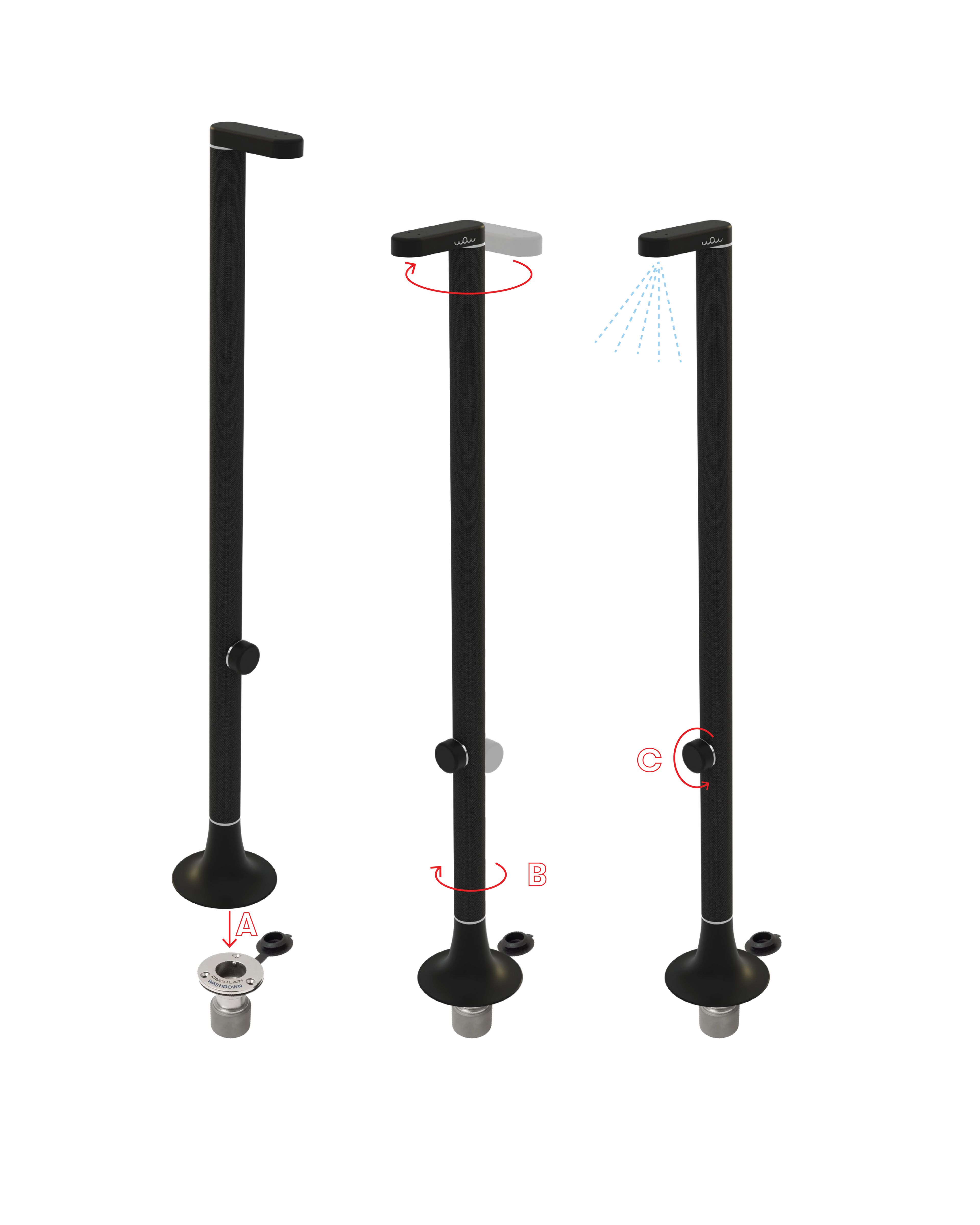 From the time you decide you need a shower, it will be no time until you will be able to enjoy it. Just remove the soft protection lid, insert the shWOWer and press down (A). Rotate approximately 90 degrees while pressing down (B) and release. Open the valve (C). Happy shower! 🚿